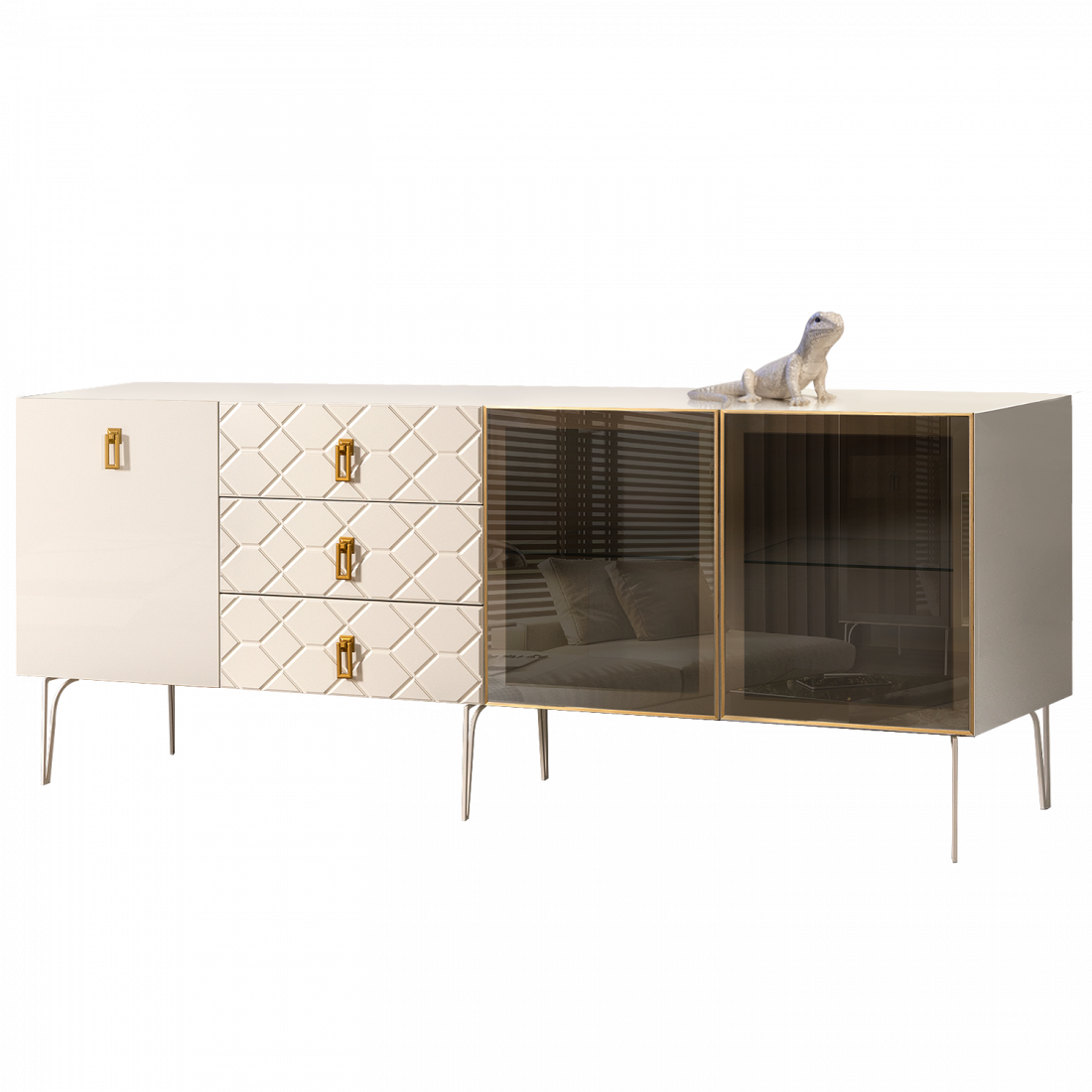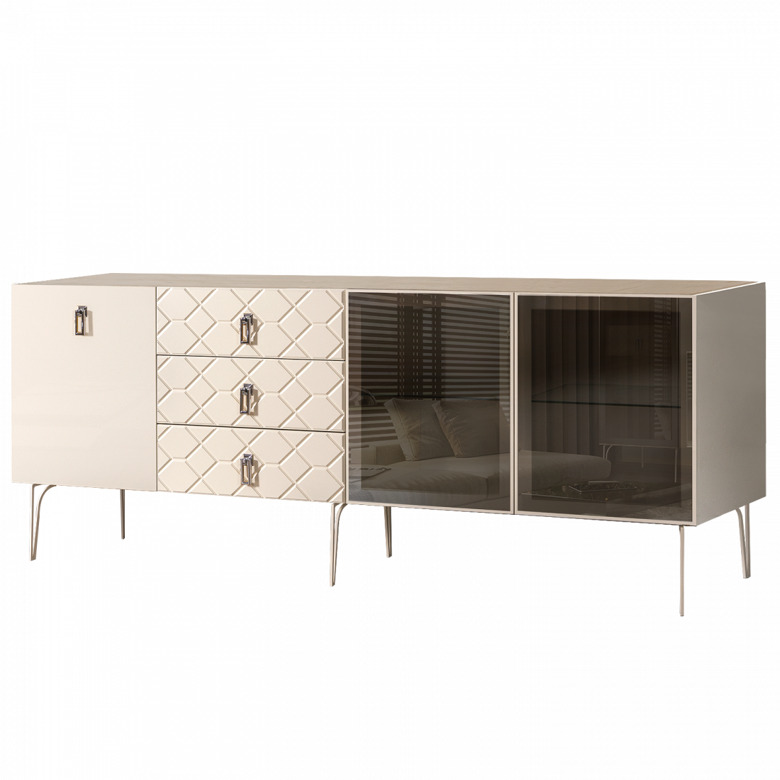 Стекло Stopsol меняет свои отражающие свойства под воздействием источников света. Поверхность, отражающая свет, мягко скроет содержимое вашего комода или витрины.
