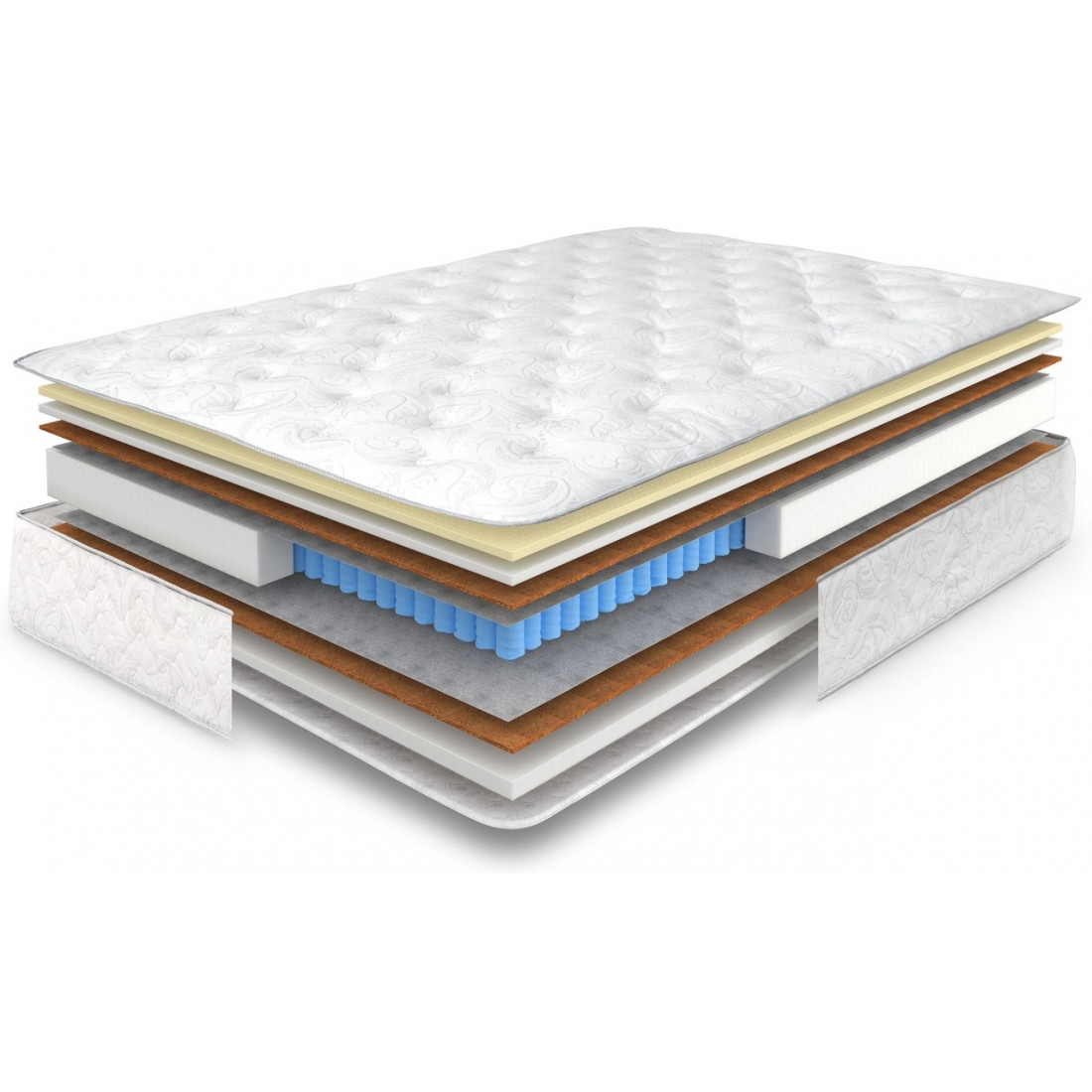 Наполнение: латекс 20 мм, ортопена средней жесткости 20/40 мм, кокосовая койра 10 мм, спанбонд, блок независимых пружин, усиление матраса по периметру.