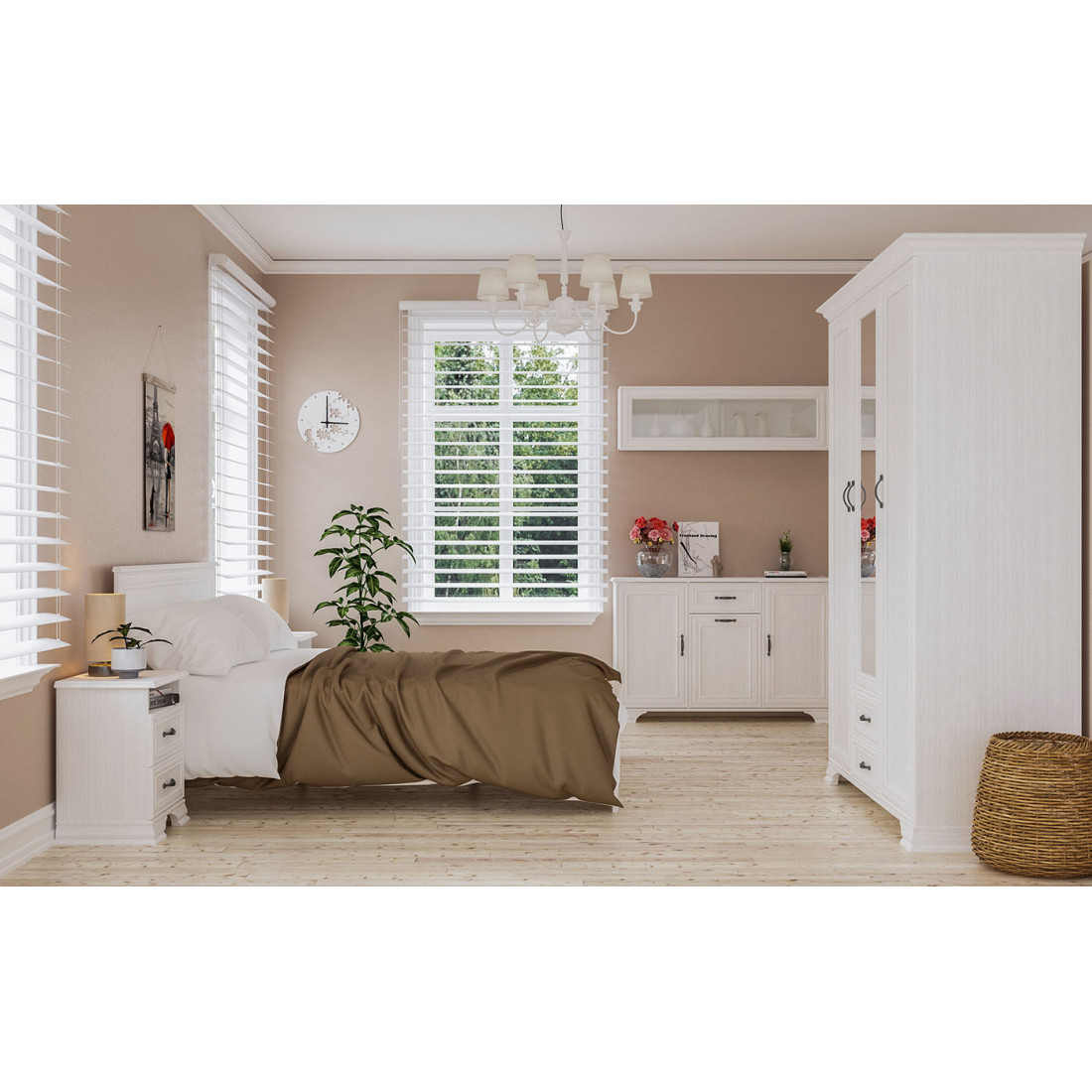 Мебель для спальни Юнона от фабрики Мебель-Неман композиция 4 - спальный гарнитур в классическом стиле с отделкой структурной фактуры, обрамленный рамочным фасадом, где металлические ручки выгодно подчёркивают стиль и изящество, всегда актуален и востребован.