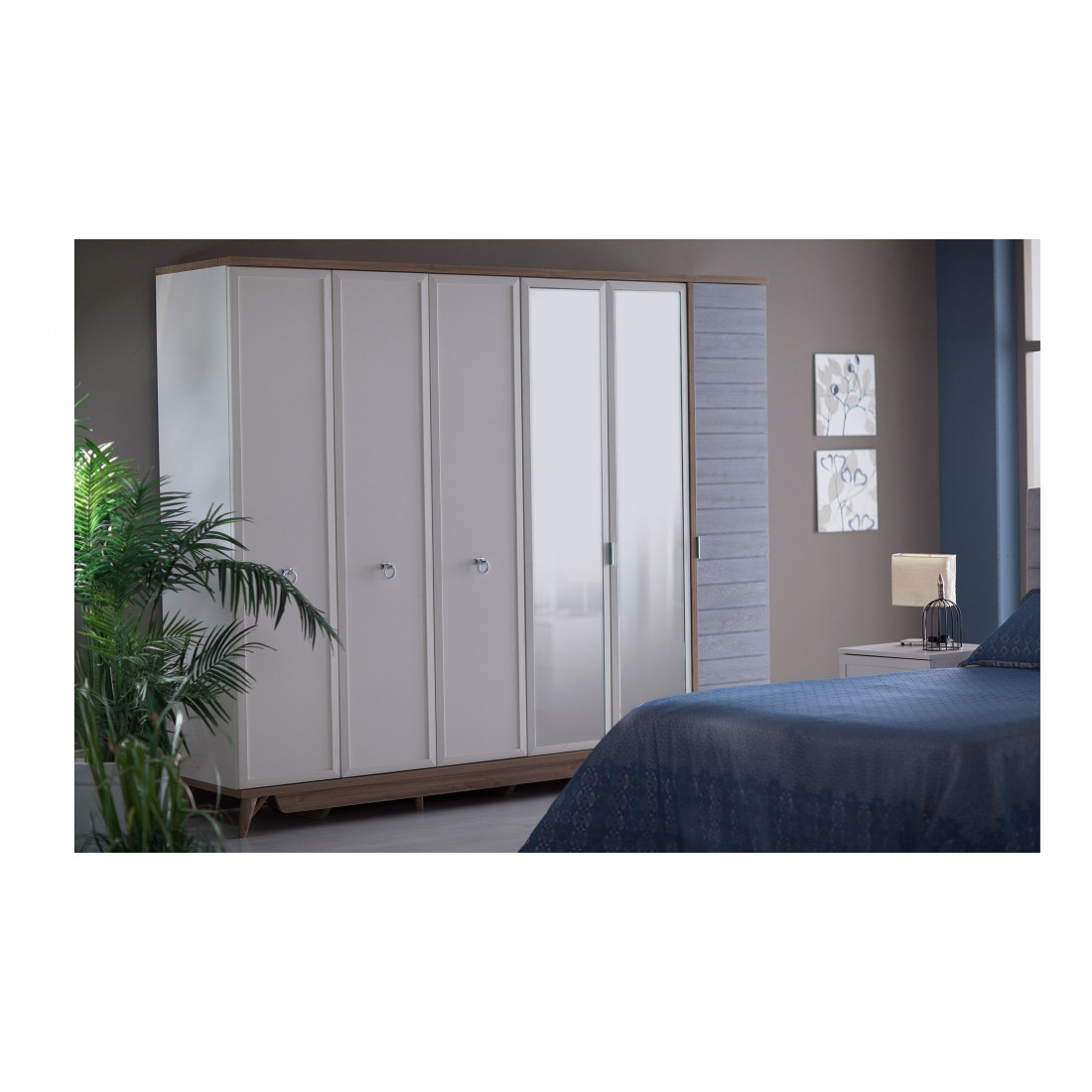 Шестидверный платяной шкаф Mavenna изготовлен из высококачественного ЛДСП производства Турция, класс эмиссии формальдегидов Е1. Две зеркальных двери по центру скрывают широкое отделение, справа узкая дверь -с имитацией досок серого цвета, слева 2 узких отделения за 2 бежевыми дверями. Шкаф вместительный, по высоте подходит для большинства помещений, глубина 62 см - позволит удобно разместить вешалки. Двери и ящики с доводчиками, обеспечивающими плавный ход и безопасность.