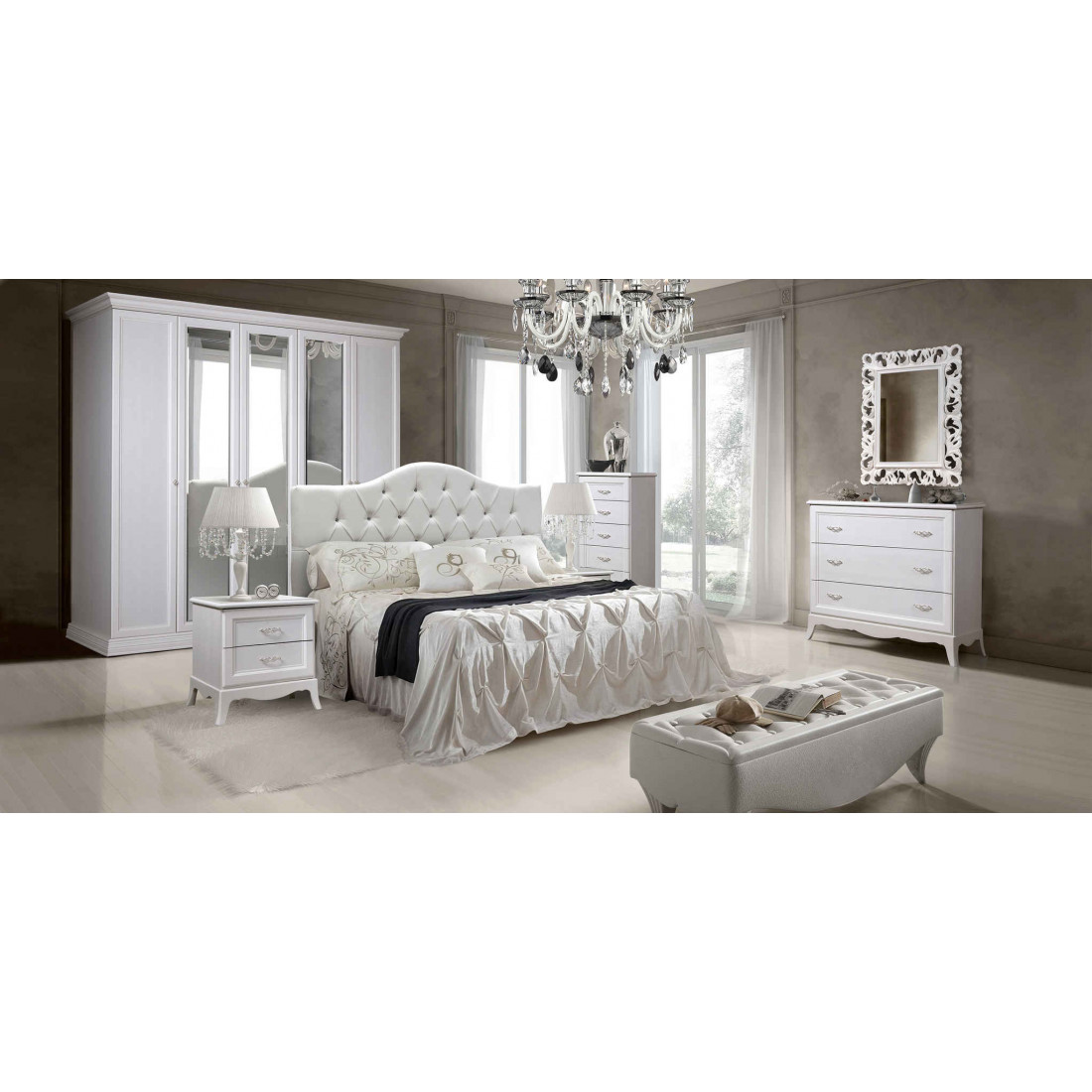 Спальня изготовлена из высококачественного ЛДСП класса Евро-1 с декором из МДФ. Ножки на тумбочках, комодах, однодверных и двухдверных шкафах сделаны из ППУ, произведенных в Италии. Двери шкафа и шуфляды комода, а также тумбочек открываются за счет бесшумных петель и направляющих фирмы «Hettich» (Германия) и «Hafele» (Германия).